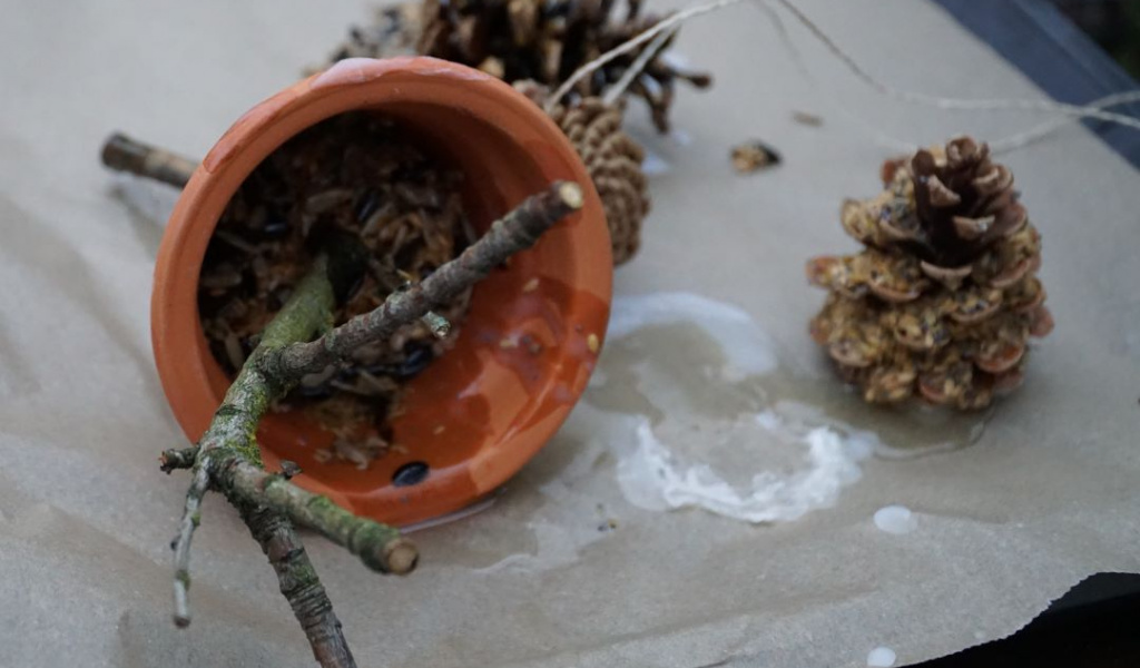 Wir stellen gemeinsam mit euch Vogelfutter her, welches ihr im Winter darbieten könnt. Dabei benutzen wir Material aus der Natur, "kochen" Talg, ziehen Tannenzapfen und matschen rum.